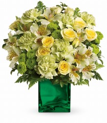 Like a breath of fresh air, this crisp, spring bouquet delivers a burst of citrus style to your lucky someone. This unique blend of yellow and green blooms in a shimmering emerald glass cube is simply brilliant!